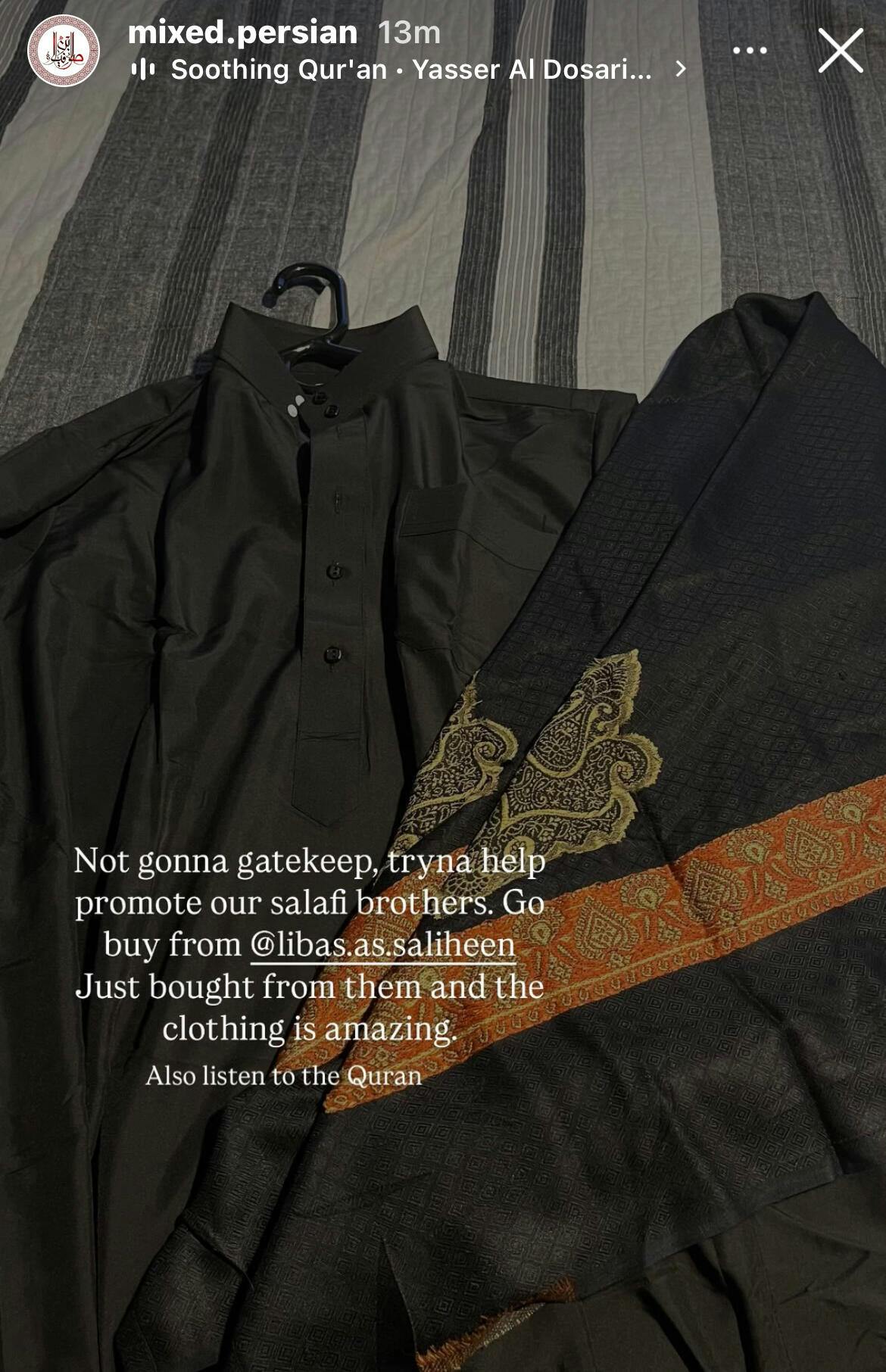 „Das Gewand eines Muslims sollte bis zur Mitte des Schienbeins reichen. Was sich zwischen dem Gewand und den Knöcheln befindet, ist weder schädlich noch tadelnswert. Alles, was tiefer als die Knöchel reicht, gehört ins Höllenfeuer. Wer sein Gewand stolz hinter sich herzieht, auf den wird Allah niemals blicken.“